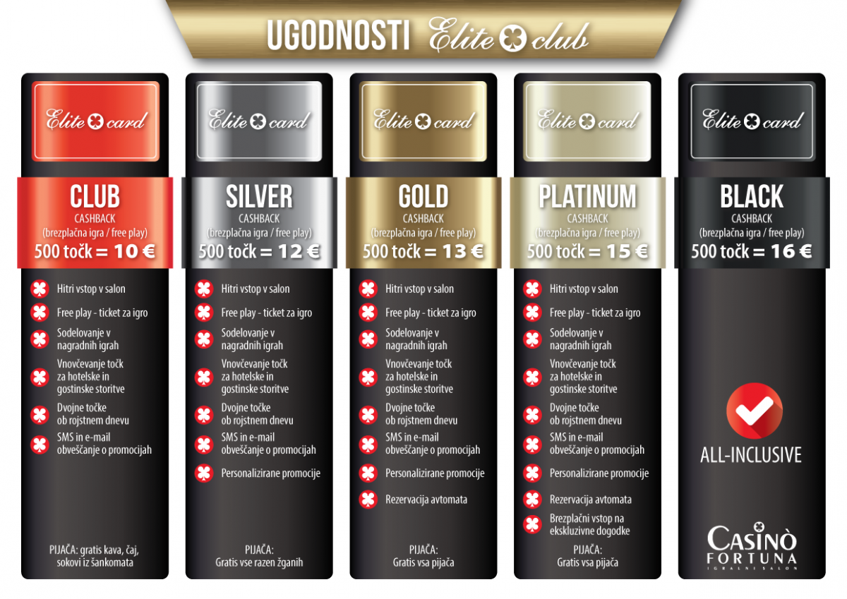Točke, zbrane s kartico Elite Club, vam bodo prinesle številne različne ugodnosti, kot so gostinske ponudbe, sodelovanje v promocijskih igrah, kuponi za žrebanja, vstopnice na posebne dogodke ter  še veliko več.  Glede na nivo vašega članstva v Elite Club-u lahko točke zamenjate tudi v igralne lističe (cashback).